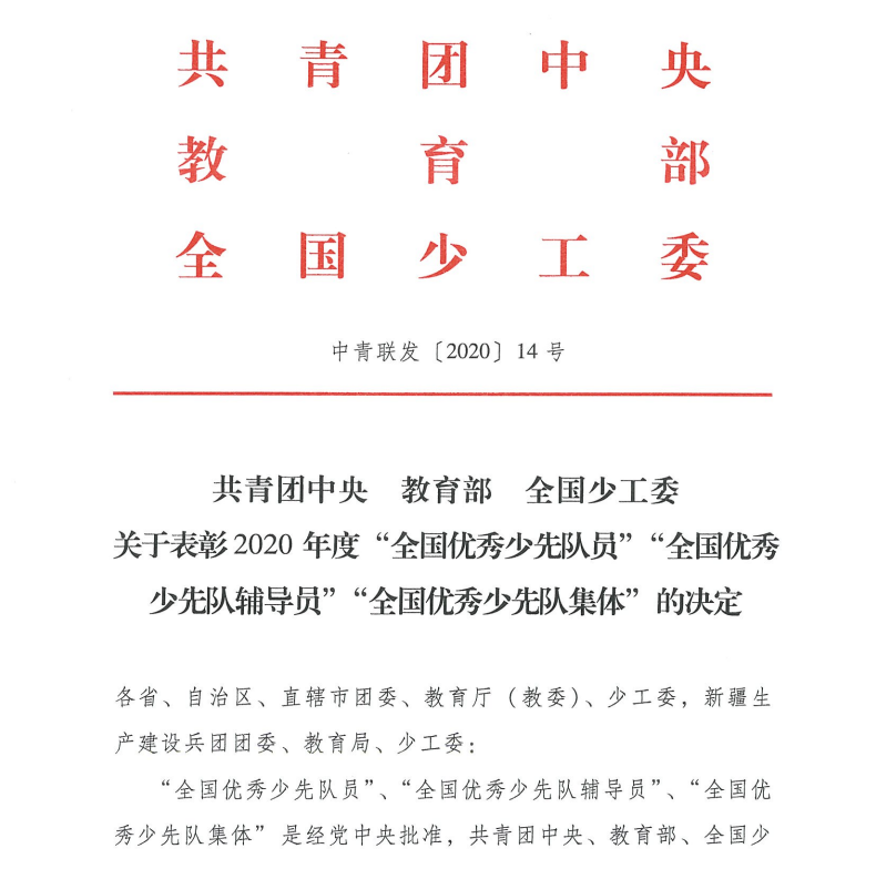 表彰2020年度“全國優(yōu)秀少先隊員”