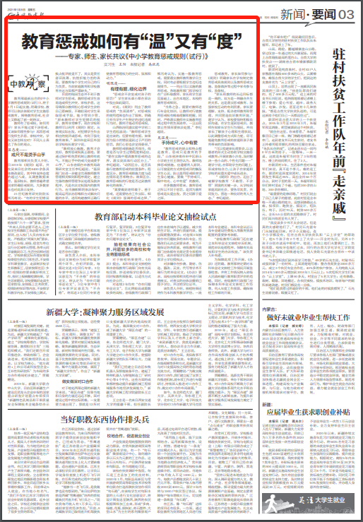“原來教師對學生犯錯后的批評、教育非常棘手,現在學校和教師可以利用《規則》規定,從客觀實際出發,對犯錯學生作出相應的批評或懲戒,有利于強化教育效果?!鄙钲谑宣}田區外國語學校校長謝學寧說。