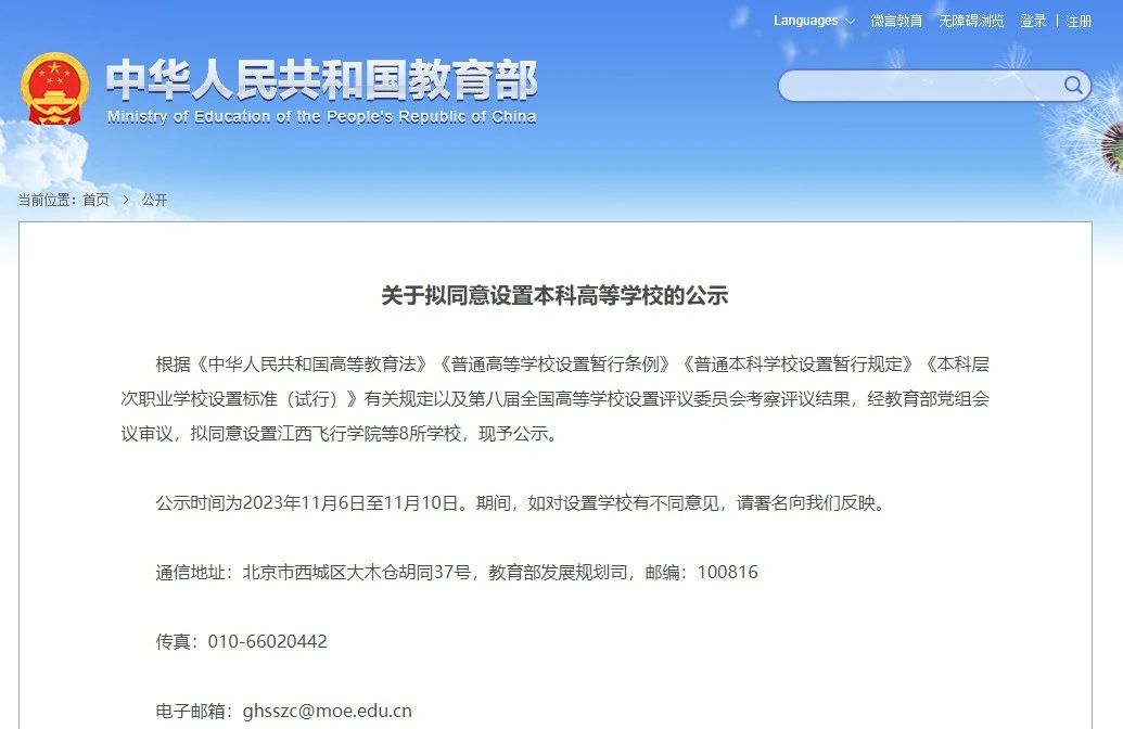 擬同意設置江西飛行學院;擬同意:贛南醫學院更名為贛南醫科大學;濰坊醫學院更名為山東第二醫科大學;重慶科技學院更名為重慶科技大學;山西師范大學現代文理學院轉設為山西電子科技學院;濱州學院更名為山東航空學院;以長春汽車工業高等專科學校為基礎設立長春汽車職業技術大學;以四川工程職業技術學院為基礎設立四川工程職業技術大學。