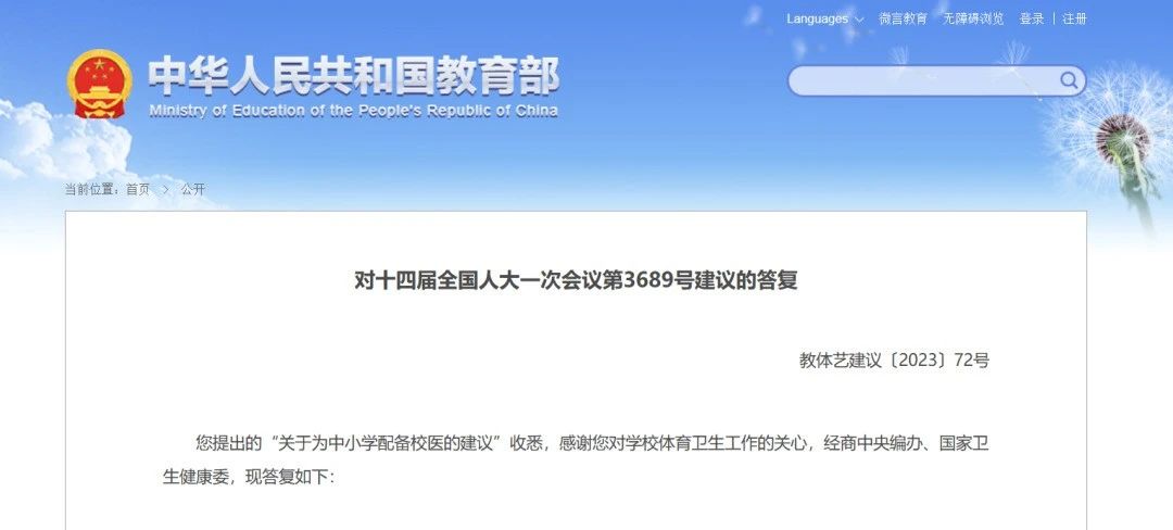 近日,教育部在答復十四屆全國人大一次會議第3689號建議,即“關于為中小學配備校醫的建議”。