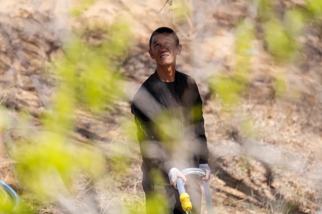 2024年4月10日,在甘肅省武威市古浪縣八步沙林場(chǎng),郭璽澆灌植被。新華社記者 費(fèi)茂華 攝