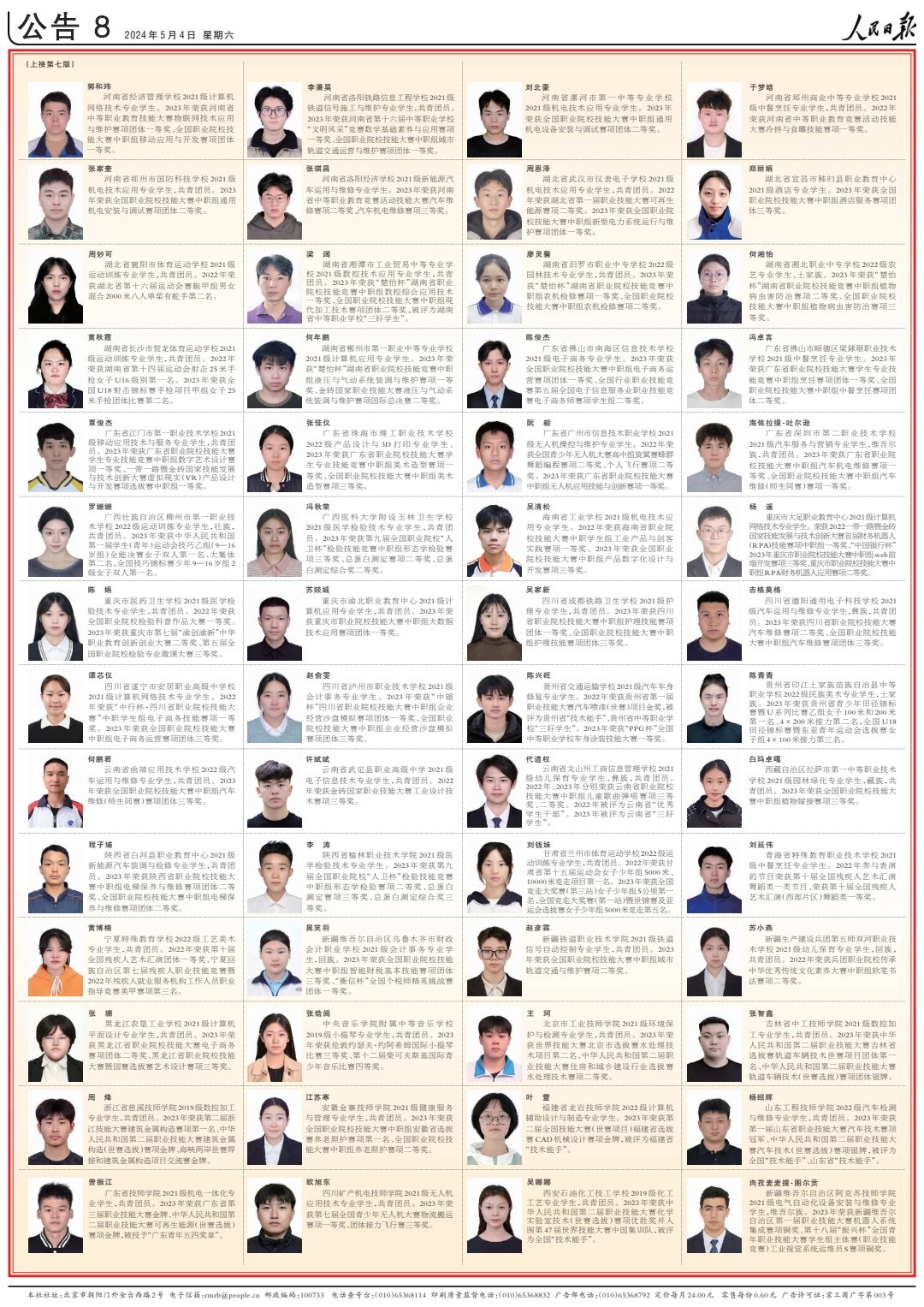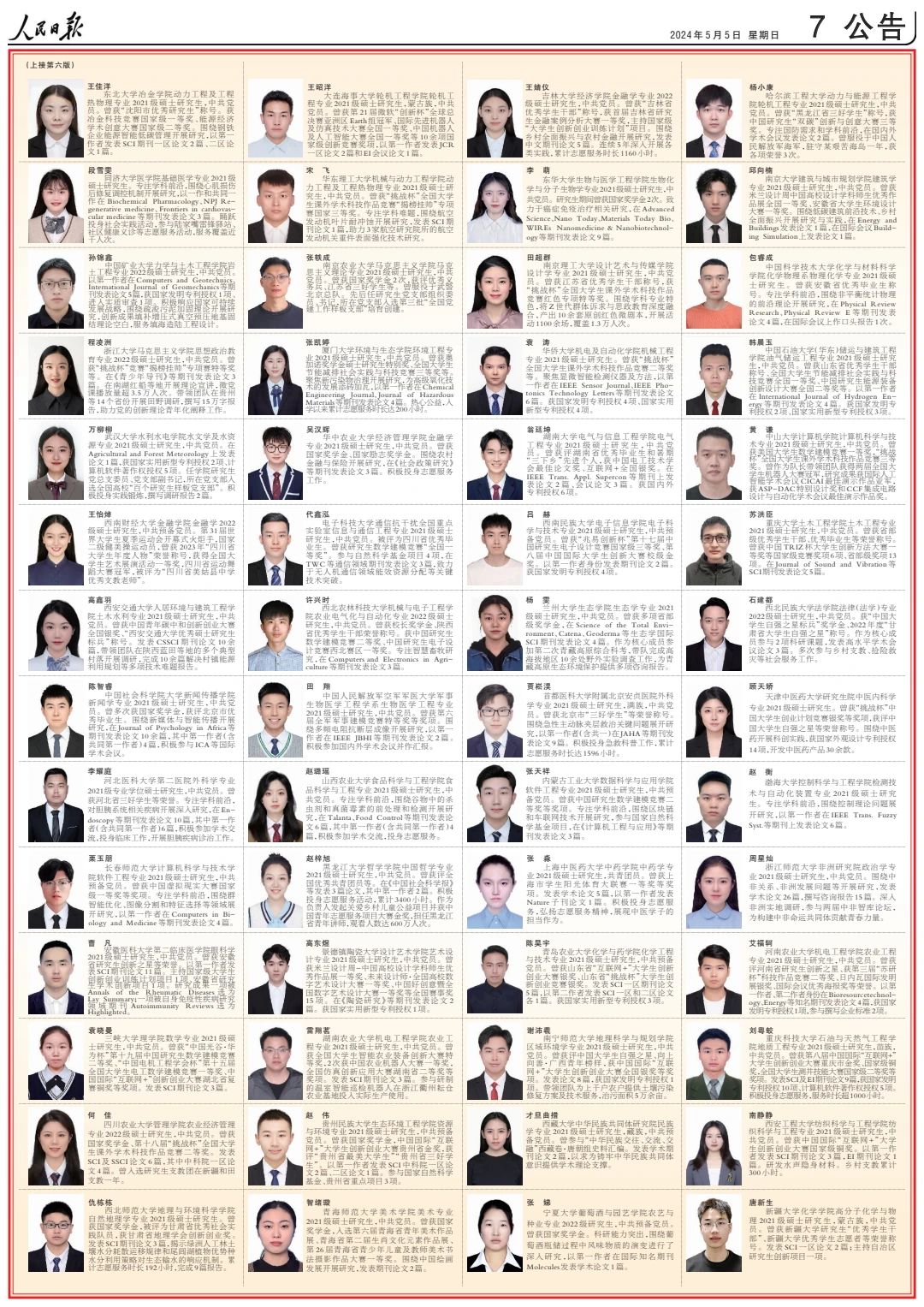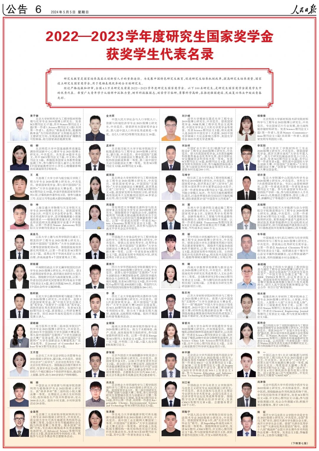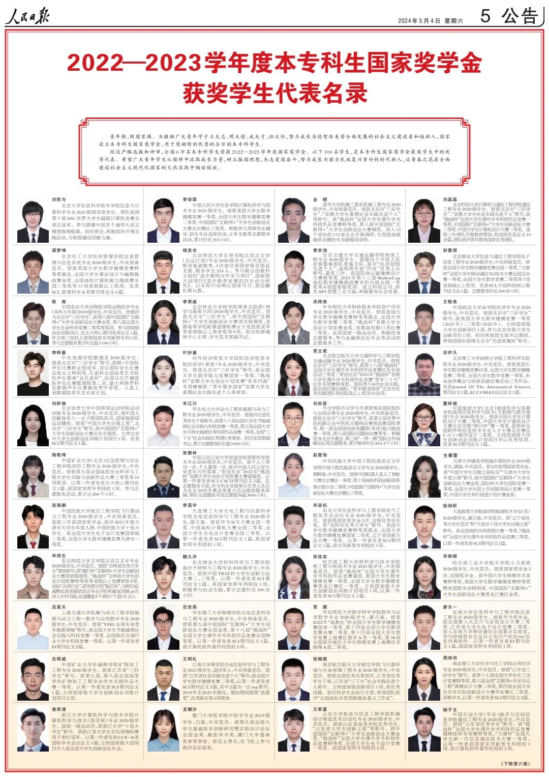 5月4日、5日出版的人民日?qǐng)?bào),用六個(gè)整版刊登了100名研究生國(guó)家獎(jiǎng)學(xué)金獲獎(jiǎng)學(xué)生優(yōu)秀代表、100名本專科生國(guó)家獎(jiǎng)學(xué)金獲獎(jiǎng)學(xué)生優(yōu)秀代表、100名中等職業(yè)教育國(guó)家獎(jiǎng)學(xué)金獲獎(jiǎng)學(xué)生優(yōu)秀代表名錄。