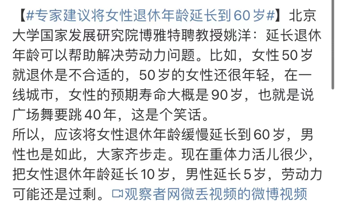 北京大學國家發展研究院教授、知名經濟學家姚洋曾在某一公開節目中提出,當前女性50歲的退休年齡設定已不適應現代社會發展,他主張應逐步將女性的退休年齡延長至60歲。