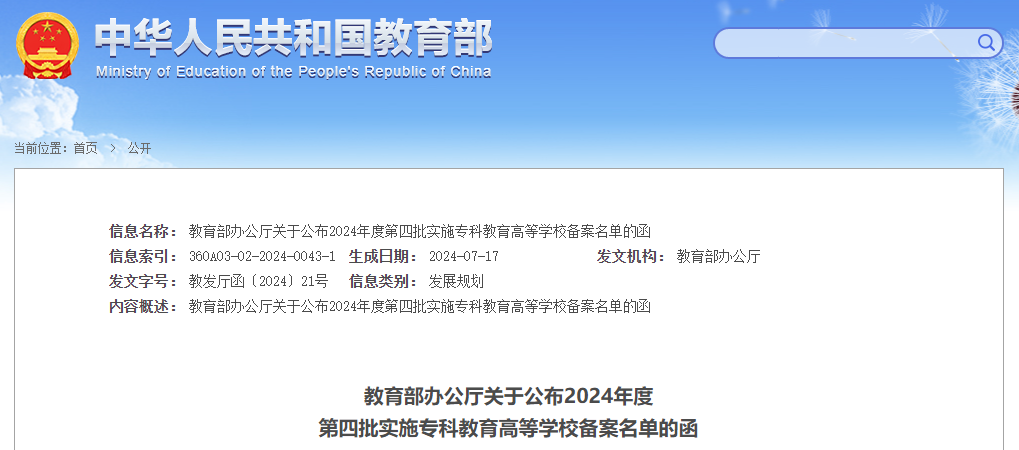 教育部公布2024年度第四批實施專科教育高等學校備案名單。
