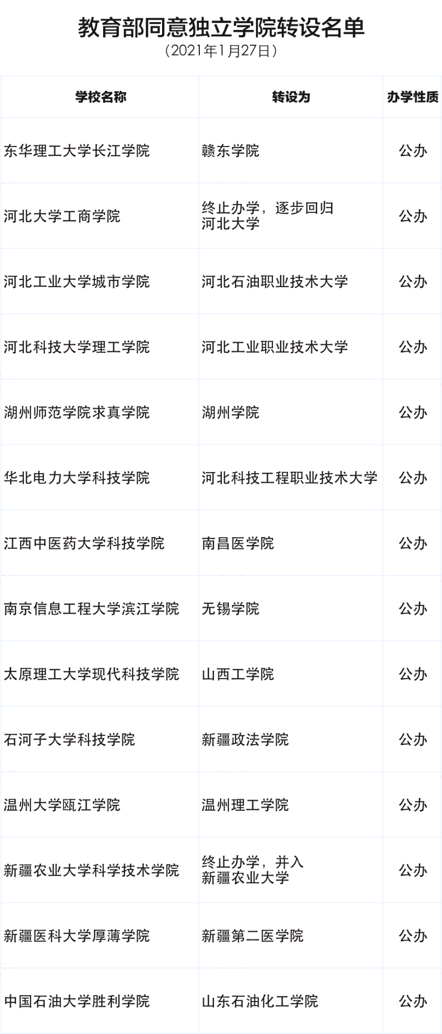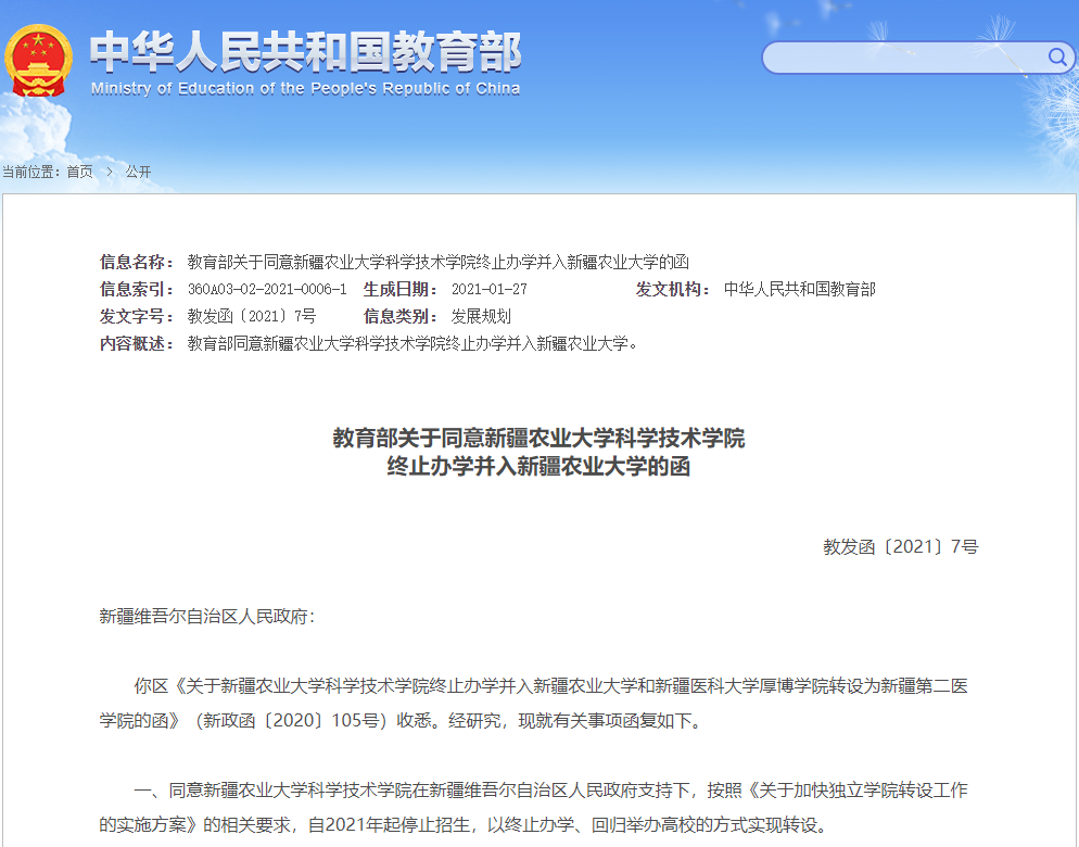 此外,同意新疆農業大學科學技術學院、河北大學工商學院2所獨立學院以終止辦學方式實現轉設。其中,新疆農業大學科學技術學院將并入新疆農業大學,河北大學工商學院回歸舉辦高校(河北大學)。