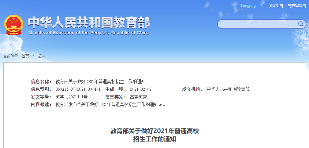 2021年普通高校招生工作要以習近平新時代中國特色社會主義思想為指導,深入貫徹黨的十九大和十九屆二中、三中、四中、五中全會精神,全面貫徹黨的教育方針,認真落實全國教育大會精神以及《深化新時代教育評價改革總體方案》,堅持穩中求進的工作總基調,統籌做好新冠肺炎疫情防控和考試招生工作,積極穩妥推進考試招生制度改革,進一步提升考試招生治理體系和治理能力現代化水平,確保普通高校考試招生工作安全、有序實施。現就有關工作通知如下。