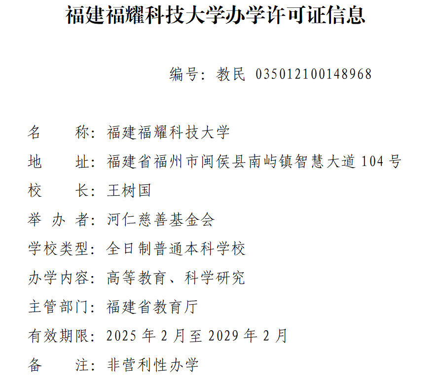 附件:福建福耀科技大學(xué)辦學(xué)許可證信息