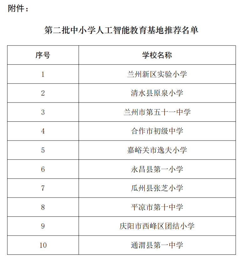為全面落實《教育部辦公廳關于加強中小學人工智能教育的通知》和《關于開展第二批中小學人工智能教育基地推薦工作的通知》(教基廳函〔2025〕15號)要求,促進人工智能助力教育變革,推進教育強國建設,經市(州)遴選推薦,省教育廳組織專家評審,擬向教育部推薦第二批中小學人工智能教育基地10個(附件)。現將擬推薦基地名單予以公示。