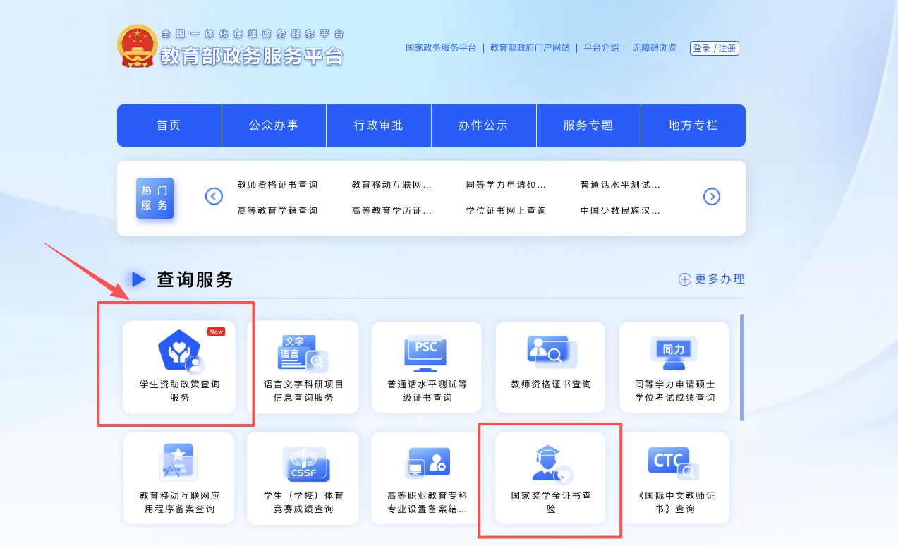 1.訪問教育部政務服務平臺(https://zwfw.moe.gov.cn/,即教育部官方網站服務板塊),在“查詢服務”板塊,選擇使用“學生資助政策查詢服務”;