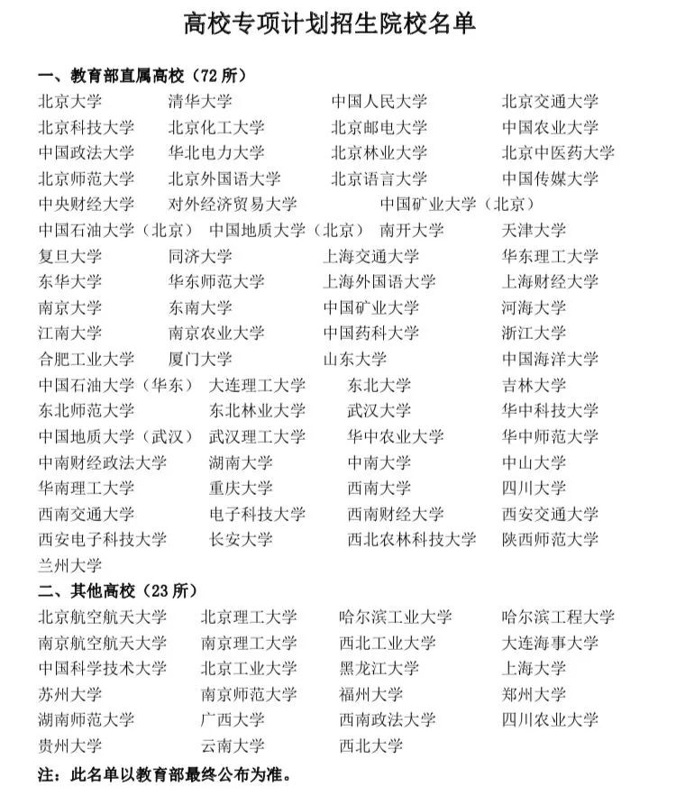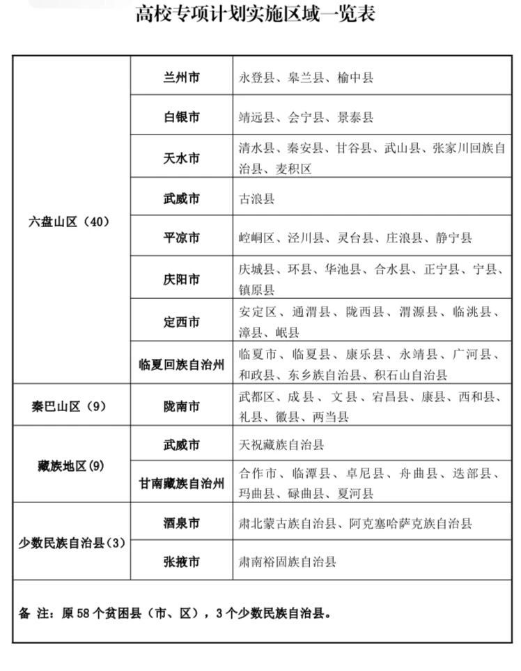 2021年實(shí)施高校專項(xiàng)計(jì)劃的院校由教育部直屬高校和教育部規(guī)定的其他高校承擔(dān)。我省實(shí)施高校專項(xiàng)計(jì)劃的區(qū)域?yàn)槭?nèi)11個市(州)的原58個集中連片貧困縣(市、區(qū))及酒泉市肅北蒙古族自治縣、酒泉市阿克塞哈薩克族自治縣、張掖市肅南裕固族自治縣等3個少數(shù)民族自治縣。