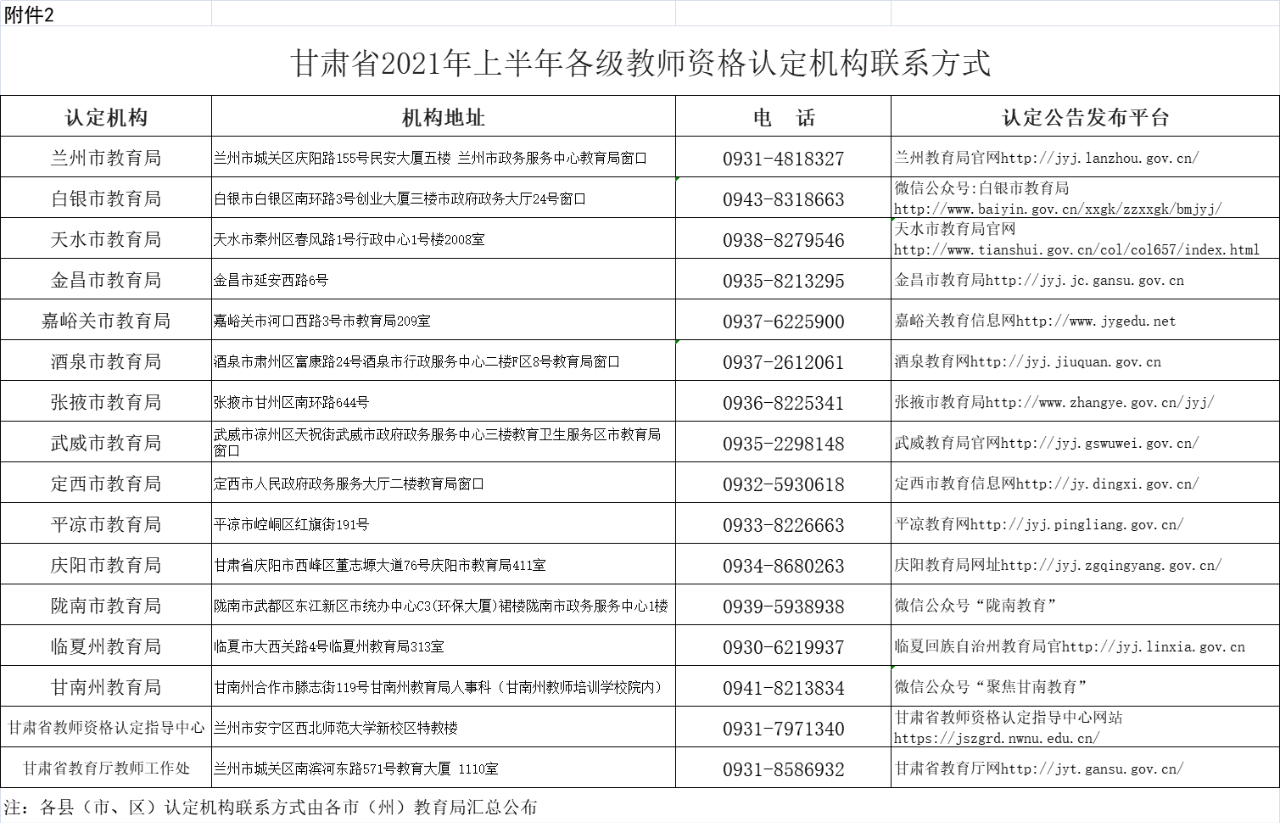2.甘肅省2021年上半年各級教師資格認定機構聯系方式