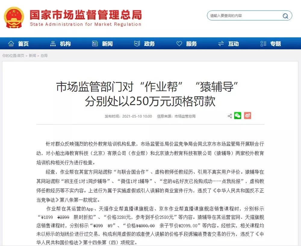 2021年5月10日,北京市市場監管局依法對作業幫和猿輔導兩家校外教育培訓機構,均處以警告和250萬元頂格罰款的行政處罰。