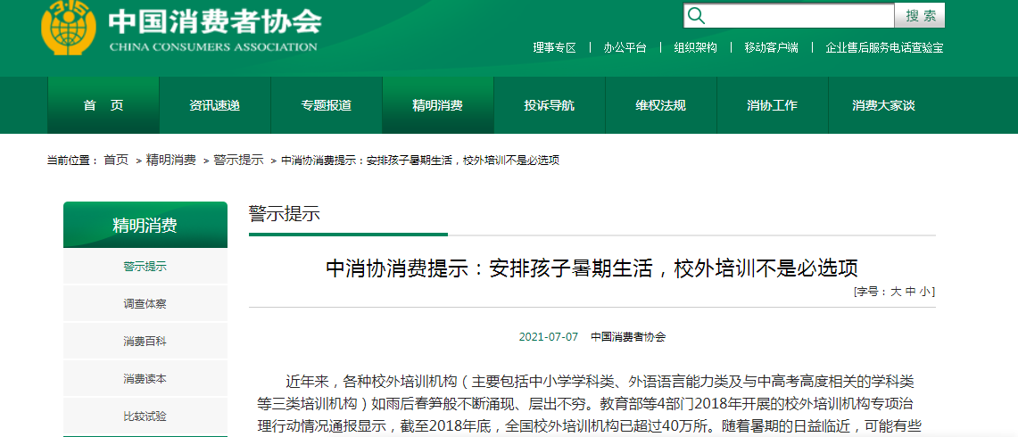 7月7日,中消協發布消費提示:安排孩子暑期生活,校外培訓不是必選項。