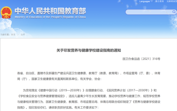 近日,教育部聯合國家衛生健康委等四部門印發《營養與健康學校建設指南》,對適應兒童青少年生長發育需要,推動學校營養與健康工作,規范學校營養與健康相關管理行為作出要求。