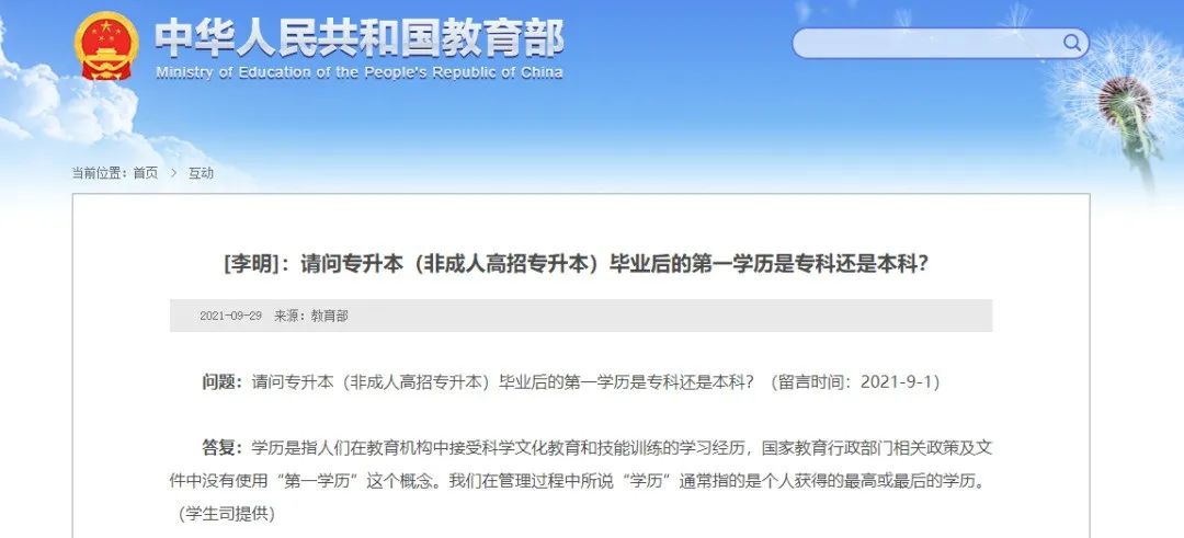 日前,教育部針對(duì)網(wǎng)友提問“請(qǐng)問專升本(非成人高招專升本)畢業(yè)后的第一學(xué)歷是專科還是本科?”進(jìn)行答復(fù)稱: