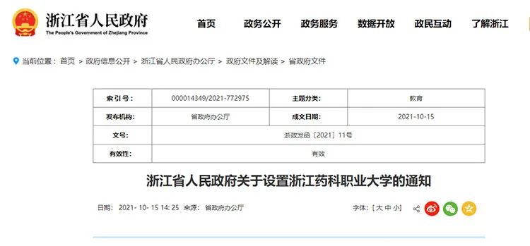 近日,浙江省人民政府印發(fā)《關(guān)于設(shè)置浙江藥科職業(yè)大學(xué)的通知》的通知。