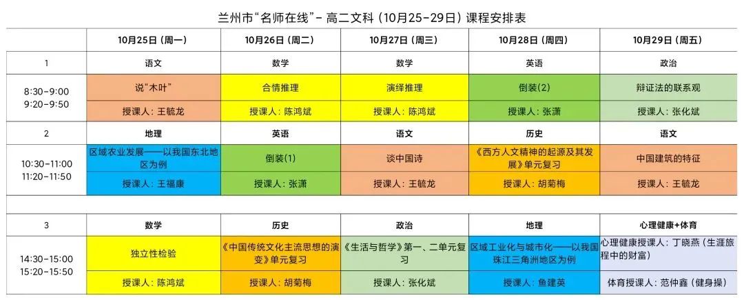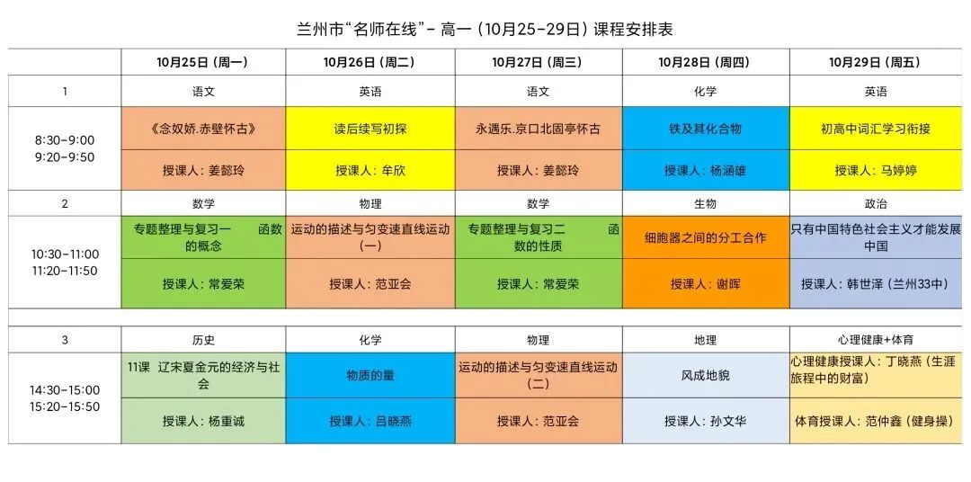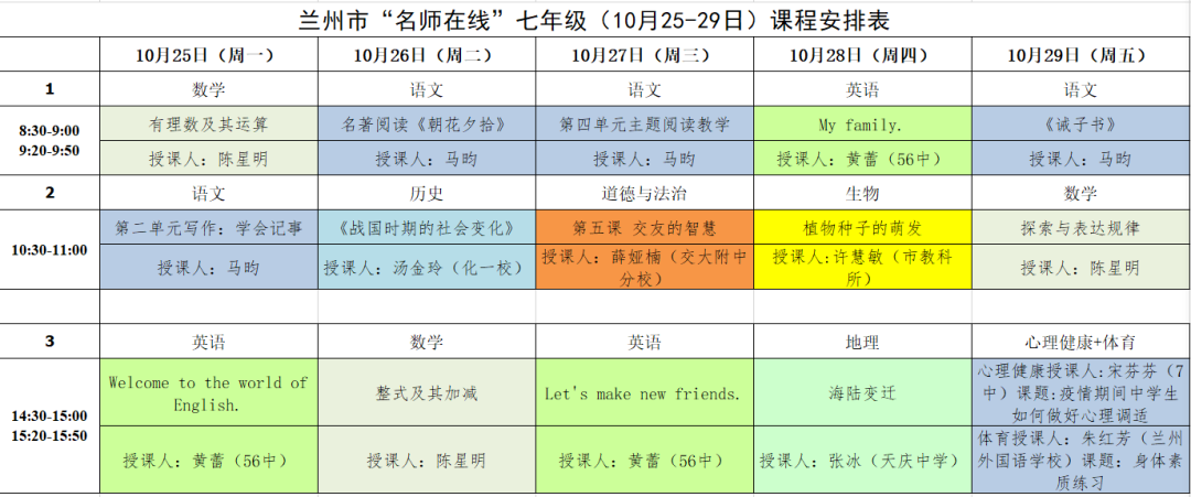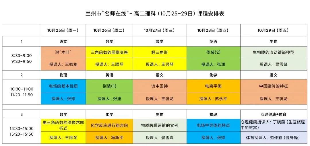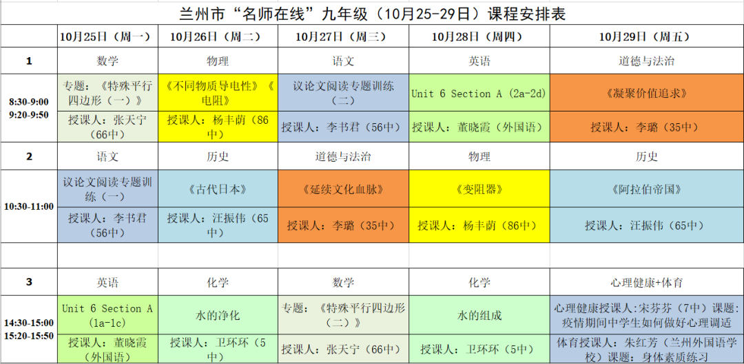 “蘭州智慧教育·名師在線”平臺為各學校提供七年級至九年級及高一、高二年級的線上教學課程,10月25日-29日具體課程安排如下: