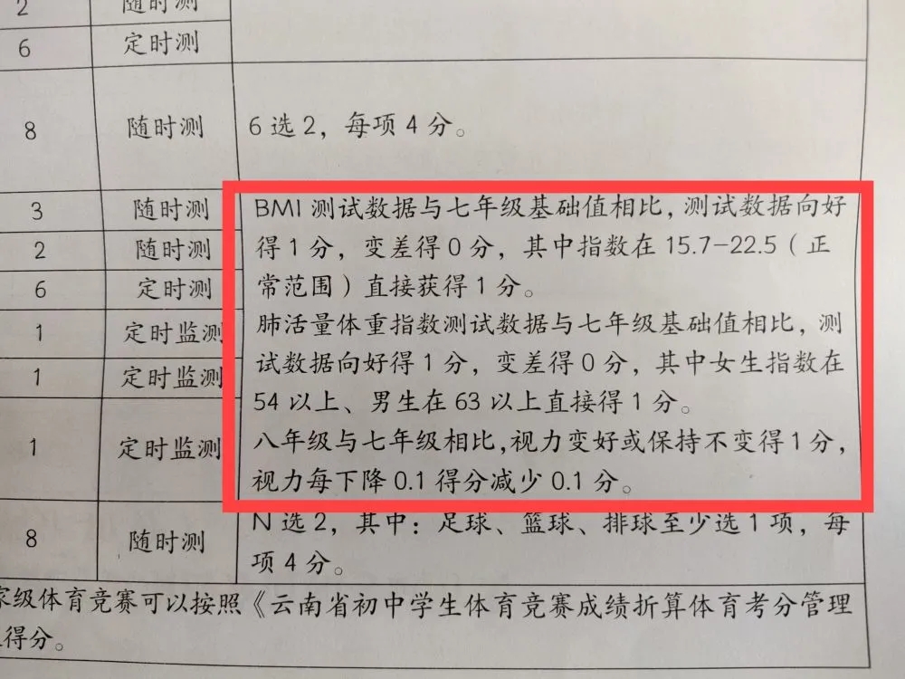 以視力為例,初一視力若在4.8及以上者可得0.5分,4.7得0.4分,4.6及以下得0.3分。此后,初二和初三兩次測試,均分別與初一相比,視力變好或不變得1分,視力每下降0.1,得分減少0.1分。