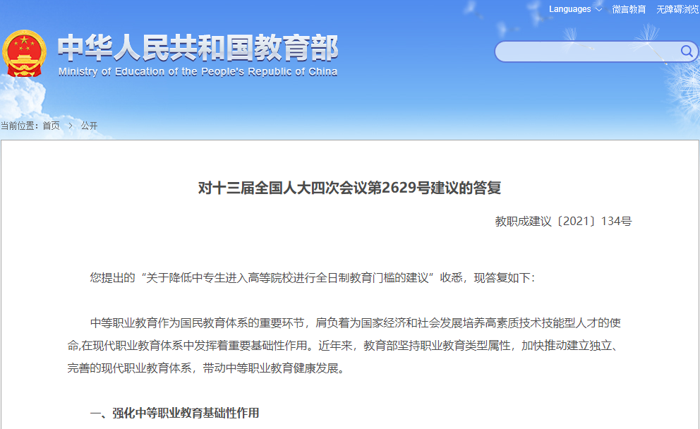 答復中提到:強化中等職業教育基礎性作用;暢通中職畢業生學歷提升通道。