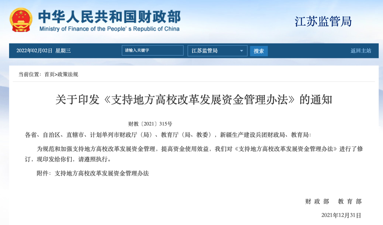 1月29日,財政部聯(lián)合教育部印發(fā)《支持地方高校改革發(fā)展資金管理辦法》的通知。