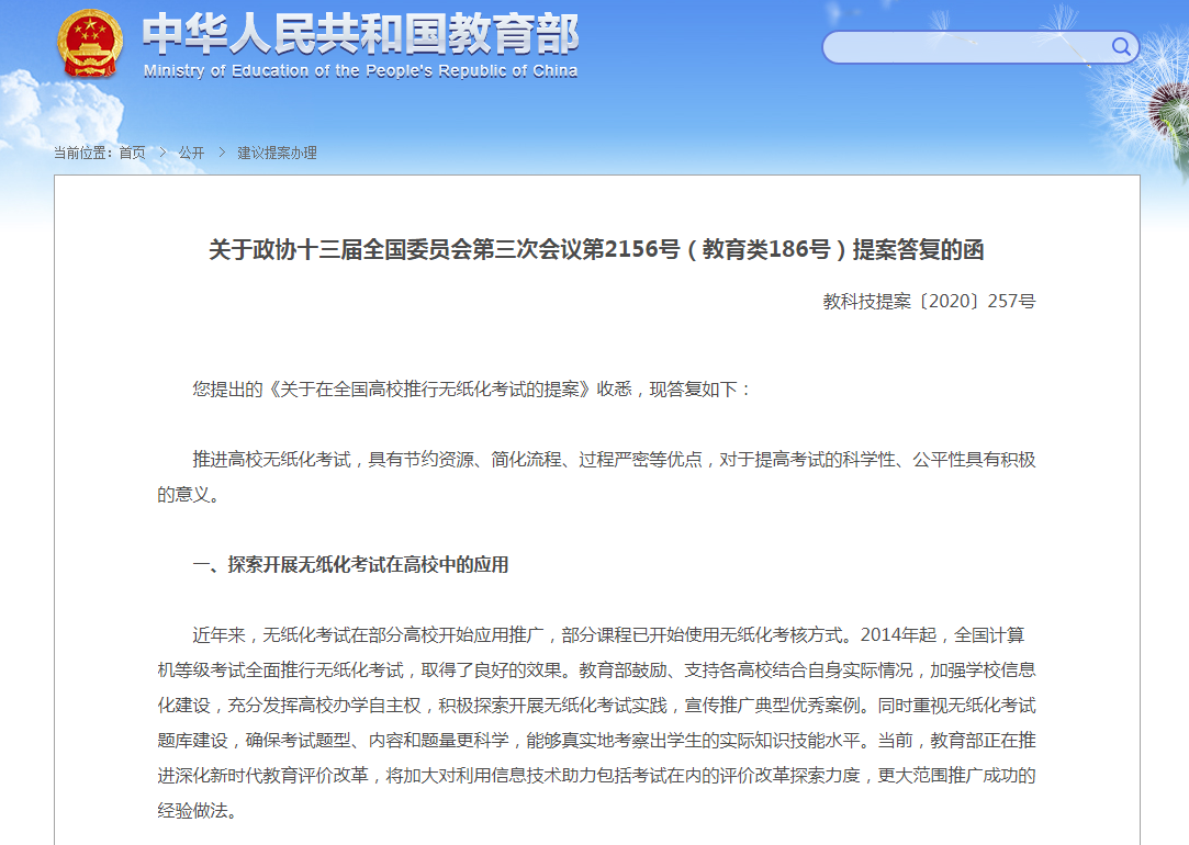 教育部指出,推進(jìn)高校無(wú)紙化考試,具有節(jié)約資源、簡(jiǎn)化流程、過(guò)程嚴(yán)密等優(yōu)點(diǎn),對(duì)于提高考試的科學(xué)性、公平性具有積極的意義。