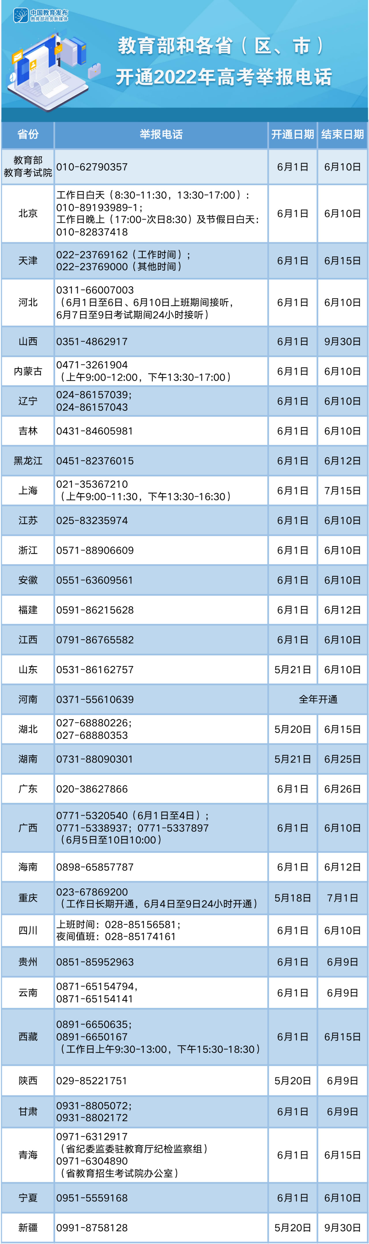 近日,教育部統一公布了教育部以及省級教育行政部門和招生考試機構2022年的高考舉報電話,歡迎廣大考生、家長及社會各界人士及時舉報反映涉及2022年高考的問題線索。教育部及各省(區、市)將會同有關部門根據舉報線索第一時間核查處理,堅決維護高考公平公正。