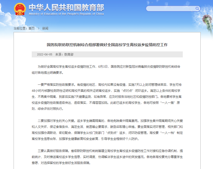 教育部網(wǎng)站6月5日消息,為做好全國高校學生離校返鄉(xiāng)疫情防控工作,6月3日,國務院應對新型冠狀病毒肺炎疫情聯(lián)防聯(lián)控機制綜合組對各地提出明確要求。