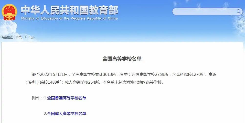 截至2022年5月31日,全國高等學校共計3013所,其中:普通高等學校2759所,含本科院校1270所、高職(專科)院校1489所;成人高等學校254所。本名單未包含港澳臺地區高等學校。