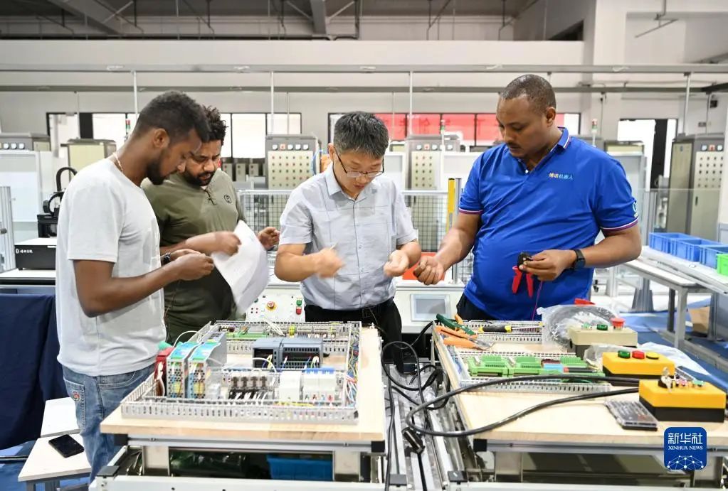 在天津職業技術師范大學,老師帶領韓士蘭(右一)和其他留學生進行實訓操作(2022年7月29日攝)。今年38歲的韓士蘭來自埃塞俄比亞,3年前,他來到天津,在天津職業技術師范大學攻讀教育學博士。新華社記者 李然 攝
