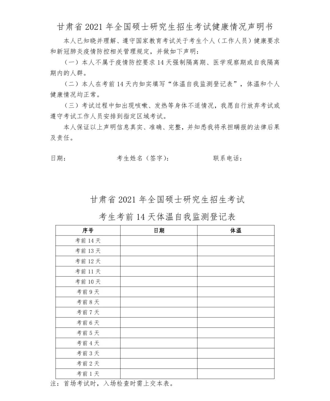 1.考生須于12月10日起,在甘肅省教育考試院、研招網或各報考點指定網站下載《2021年全國碩士研究生招生考試考生健康狀況聲明書》和體溫自我監測登記表,通過“甘肅新健康”申領并打印健康碼。自12月12日開始考生每日自行進行體溫監測。