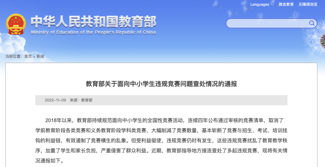 11月9日,教育部發布關于面向中小學生違規競賽問題查處情況的通報。