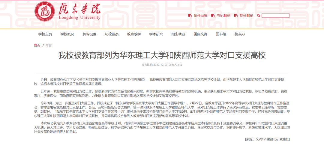 隴東學院12月3日在其官網發布消息:“我校被教育部列入對口支援西部地區高等學校計劃,由華東理工大學和陜西師范大學對口支援我校,這標志著我校對口支援工作取得實質性進展…… 本次成功獲準列入教育部對口支援西部地區高等學校計劃,對我校申請碩士學位授予單位和建設西部高水平應用型本科高校具有十分重要的意義。”